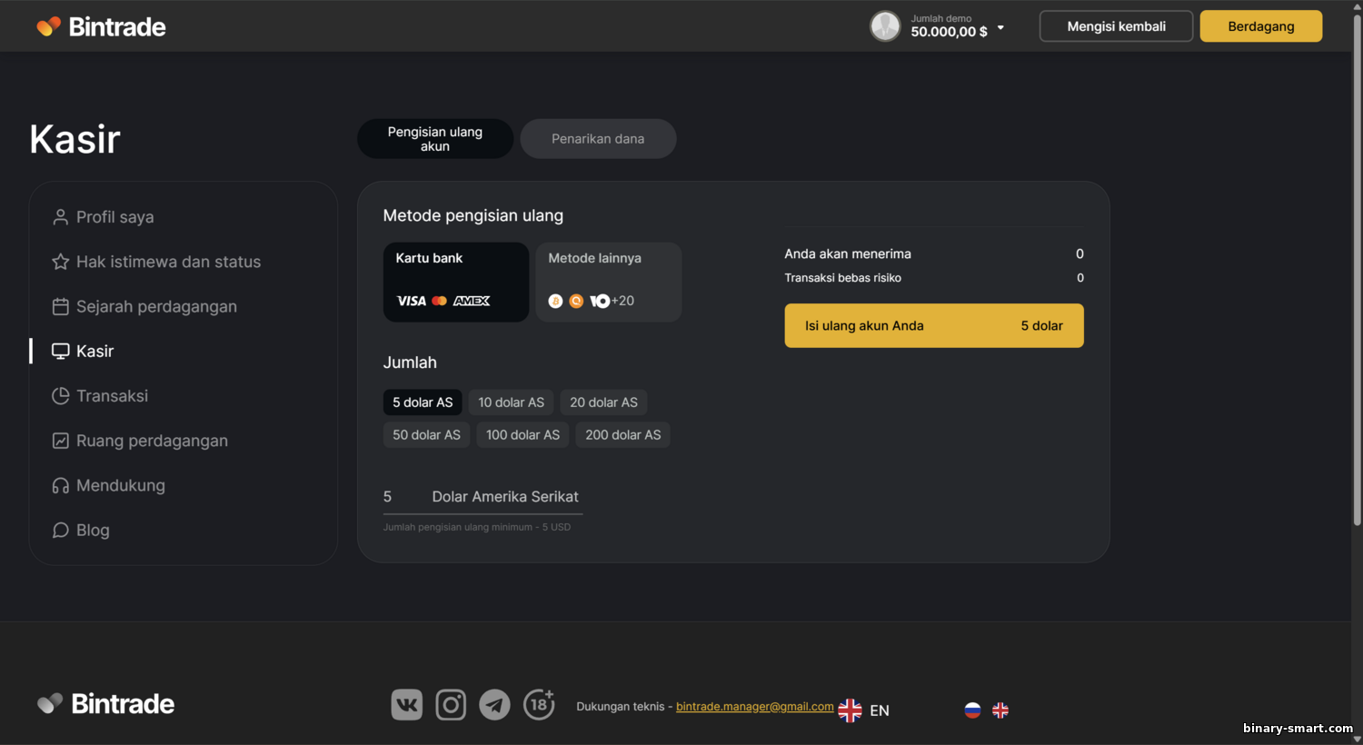 - Program loyalitas dan level. Beberapa pesaing (mis. Binomo) memiliki program bertingkat: makin banyak trading, makin banyak fasilitas — bonus lebih tinggi, penawaran ulang tahun, dsb. Tidak ada hal serupa yang terlihat publik untuk BinTrade. Sesekali, klien aktif bisa mendapat bonus individual atau penarikan “prioritas,” tetapi tidak ada skema loyalitas yang transparan.
