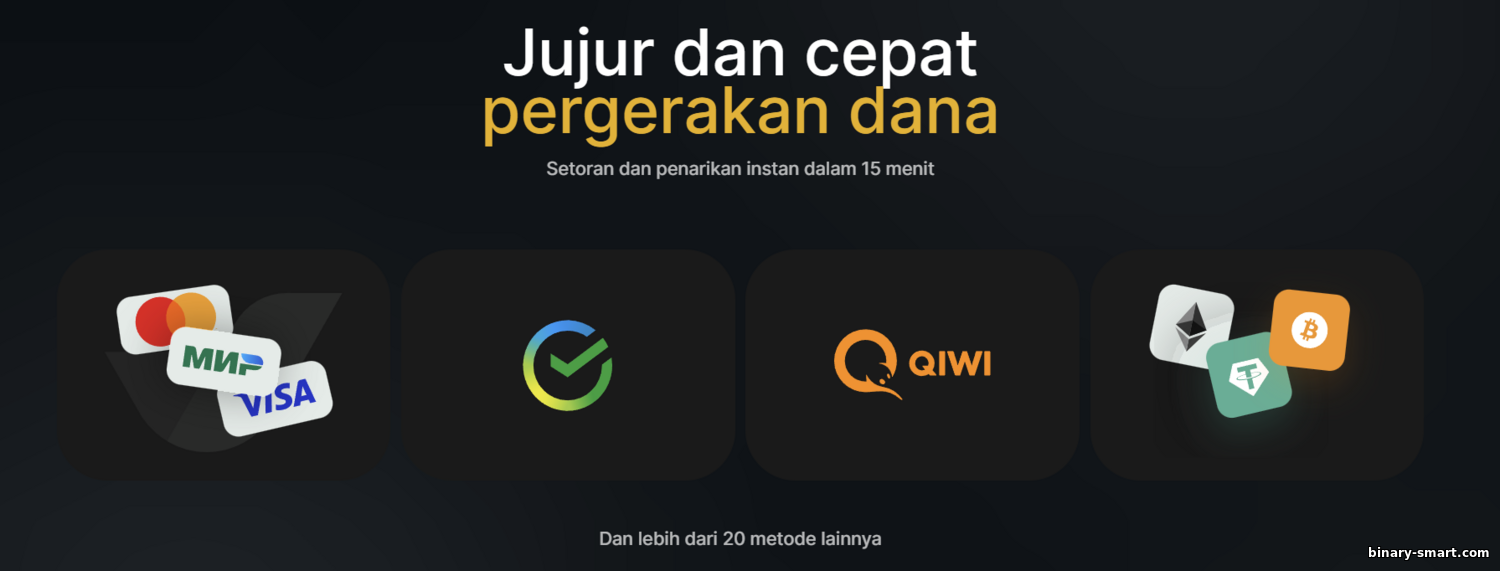 Singkatnya, klien di Rusia dapat mendanai hampir dengan cara apa pun. Deposit minimum 500 rubel (via kanal apa pun). Deposit via kartu dan e-wallet biasanya masuk seketika atau dalam hitungan menit. Broker mengklaim tanpa biaya untuk dana masuk dan bahkan menyatakan “tanpa biaya untuk semua transfer dan pembayaran.” Tetap saja, penyedia pembayaran Anda bisa mengenakan biaya — misalnya operator seluler menarik porsi tertentu, dan dompet digital bisa mengenakan biaya top-up. Itu di luar kendali broker.