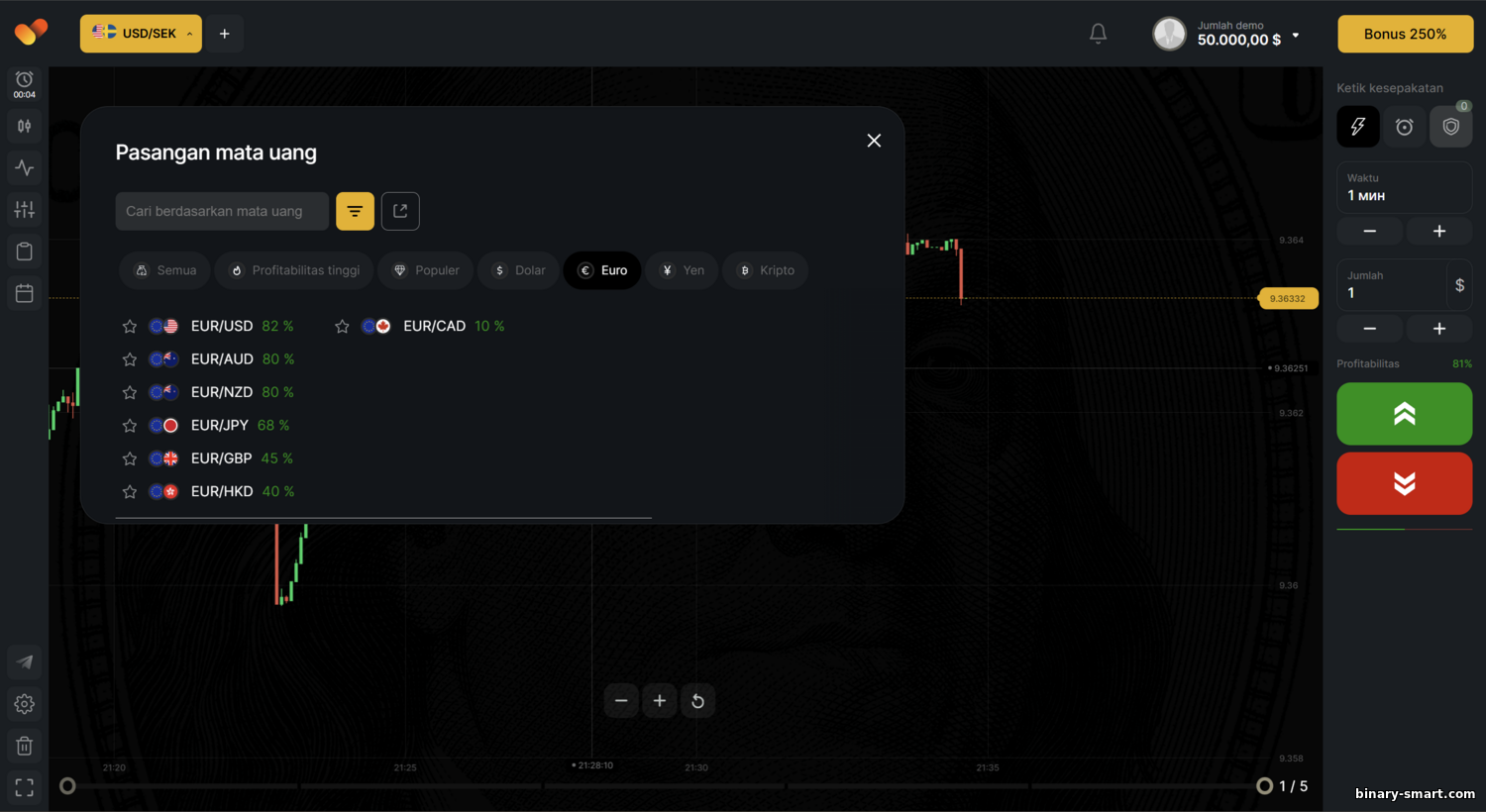 - Aset tersedia. BinTrade memungkinkan Anda berspekulasi atas perubahan harga berbagai underlying. Menurut situs, termasuk pasangan Forex dan beberapa kripto. Jadi Anda bisa berspekulasi di EUR/RUB, USD/JPY, BTC/USD, dll. Daftar aset lengkap tidak dipublikasikan — tidak lazim, karena broker biasanya membanggakan ratusan. Ini mengindikasikan lineup yang sempit. Kemungkinan Anda mendapat pasangan FX mayor (USD, EUR, RUB, GBP, JPY), beberapa kripto populer (Bitcoin, Ether), dan mungkin komoditas atau indeks terbatas. Pesaing menawarkan jauh lebih banyak: Quotex dan Pocket Option mencantumkan 100+ aset (saham Apple, emas, minyak, S&P 500, dll.). Jika daftar BinTrade memang terbatas, itu negatif — diversifikasi minim. Untuk pemula, fokus pada beberapa pasangan bisa jadi lebih sederhana.