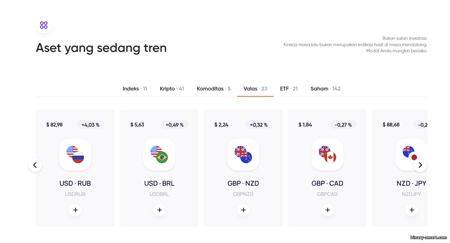 - Forex – pasangan mata uang mayor dan minor. Deskripsinya menyebut Anda bisa memperdagangkan pasangan populer (EUR/USD, GBP/CAD, USD/JPY, dll.) termasuk beberapa mata uang eksotik.