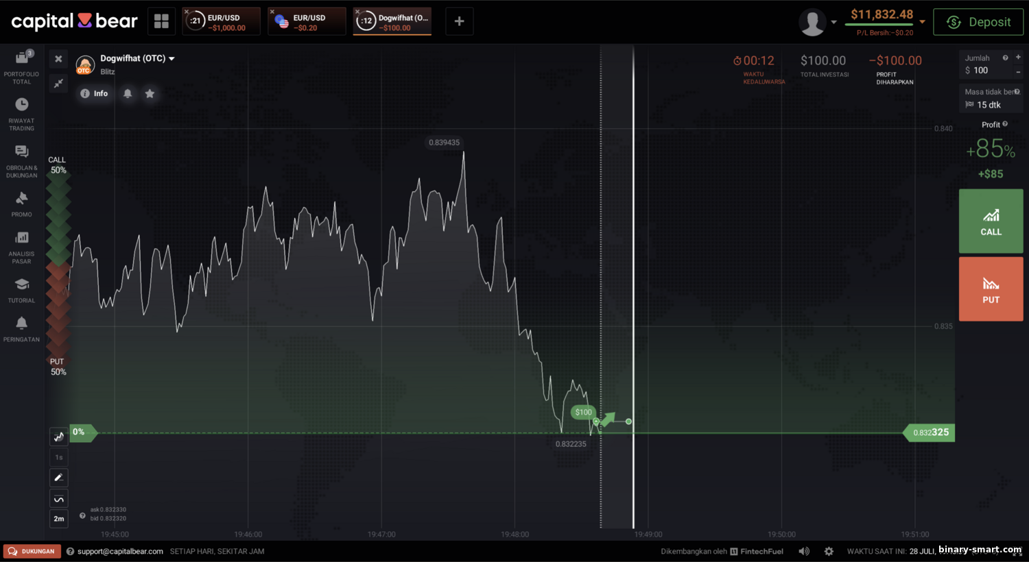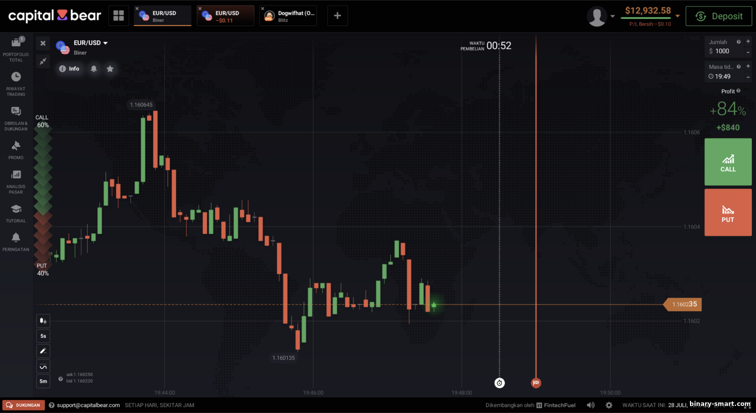 Binary options adalah produk berisiko ekstrem, lebih mirip judi ketimbang investasi. Banyak yurisdiksi sudah melarangnya. Statistik kejam: 80–90 % klien konsisten rugi. Dengan payout 90 %, nilai harapan tiap trading negatif meskipun peluang menebak 50/50; broker online pasti untung. Sejarah penuh “bucket shop” yang memanipulasi kuotasi agar klien kalah. Capital Bear sangat menonjolkan opsi biner—terlihat dari materi pemasaran dan tata letak platform (bahkan menyebut diri “platform trading opsi biner”). Bagi profesional, itu langsung sinyal bahaya: perusahaan bereputasi telah meninggalkan produk ini; di sini justru jadi magnet utama. Artinya, model bisnisnya diduga mengambil posisi berlawanan dengan nasabah: kerugian Anda, laba mereka.