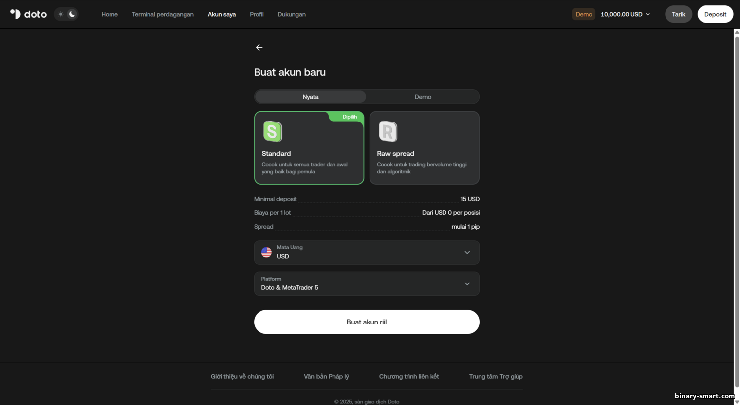 - Mulai trading. Beralih ke tab platform – baik terminal web Doto maupun MT4/MT5 Anda menggunakan kredensial yang diberikan. Pastikan dana sudah masuk, pilih instrumen dan lakukan trade pertama. Untuk pemula saya sarankan memulai di demo atau ukuran minimum agar memahami mekanik. Jangan lupa pasang stop-loss untuk melindungi modal.