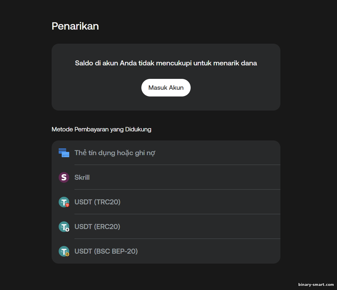 - Danai deposit. Untuk mulai trading live, setor dana. Minimal $15 – bahkan kartu bank mengizinkan jumlah sekecil itu. Pilih metode (kartu, e-wallet, kripto – detail di bagian berikutnya) dan ikuti petunjuk. Sebagian besar metode masuk instan atau dalam 15 menit. Setelah deposit muncul di saldo, Anda bisa mulai trading.