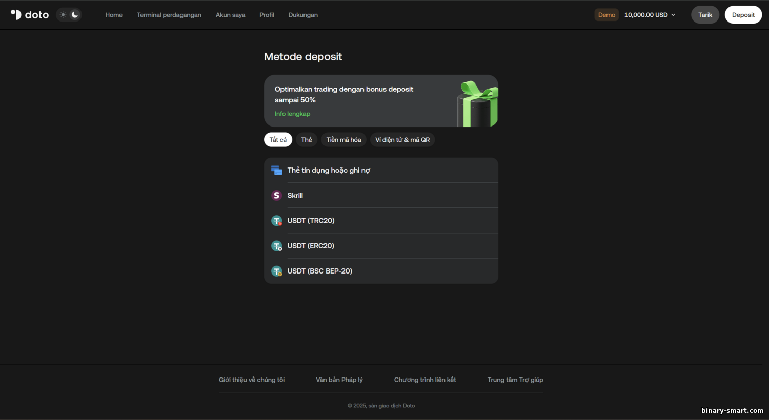 Penting: Doto, seperti semua broker teregulasi, mewajibkan metode pendanaan dan penarikan dimiliki Anda pribadi. Gunakan hanya kartu dan dompet milik Anda – nama di sana harus cocok dengan profil Doto Anda. Aturan keamanan ini mencegah pencucian uang dan melindungi Anda dari pembayaran curang ke pihak ketiga.