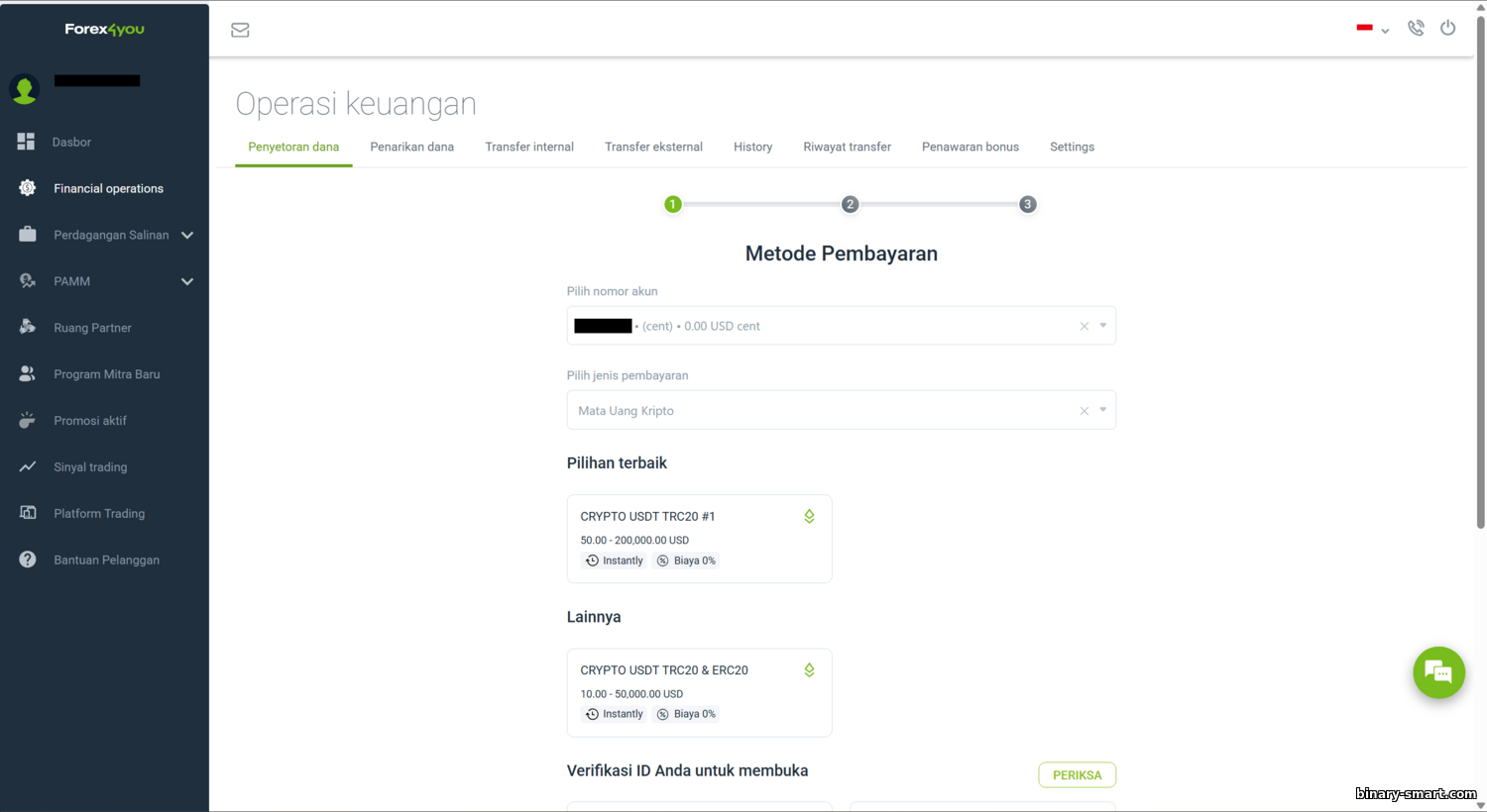 Forex4you mendukung beragam opsi deposit sesuai preferensi regional. Visa/Mastercard, transfer bank (SWIFT), e‑wallet, dan bahkan kripto tersedia. Di antara e‑wallet: Skrill, Neteller, WebMoney, QIWI, YooMoney, FasaPay, Perfect Money, dll. Misalnya, deposit WebMoney atau Skrill bersifat instan; minimum $1; biaya broker 0%. Kartu biasanya memiliki minimum $10–20; dana masuk instan atau dalam satu jam; biaya broker 0% (bank Anda bisa mengenakan ~2,5%). Jalur pembayaran lokal tersedia di wilayah tertentu: bank lokal di Asia Tenggara, perbankan online di India, dan layanan regional di Amerika Latin. Kabinet menampilkan daftar lengkap untuk negara Anda. Semua pembayaran terlindungi (SSL); mata uang akun biasanya USD; mata uang lain dikonversi pada kurs sistem. Tanpa setoran minimum formal — bahkan $1 — broker ini menarik bagi pemula.