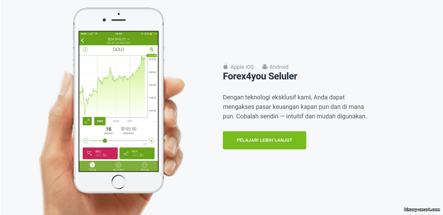 - Aplikasi seluler Forex4you. Aplikasi iOS/Android milik sendiri yang menggabungkan trading dan manajemen akun. Anda bisa buka/tutup transaksi, memantau kuotasi, dan melihat chart dengan set indikator. Aplikasi mencakup kalender ekonomi, feed berita, dan notifikasi push. Pendanaan dan penarikan tersedia di dalam aplikasi, memberi Anda kabinet trader penuh di ponsel. Ulasan pengguna menyoroti desain bersih dan kinerja stabil. Seiring waktu aplikasi ini menjadi alternatif layak MetaTrader untuk trading saat bepergian, dan Anda bahkan bisa menyalin leader Share4you dari aplikasi.