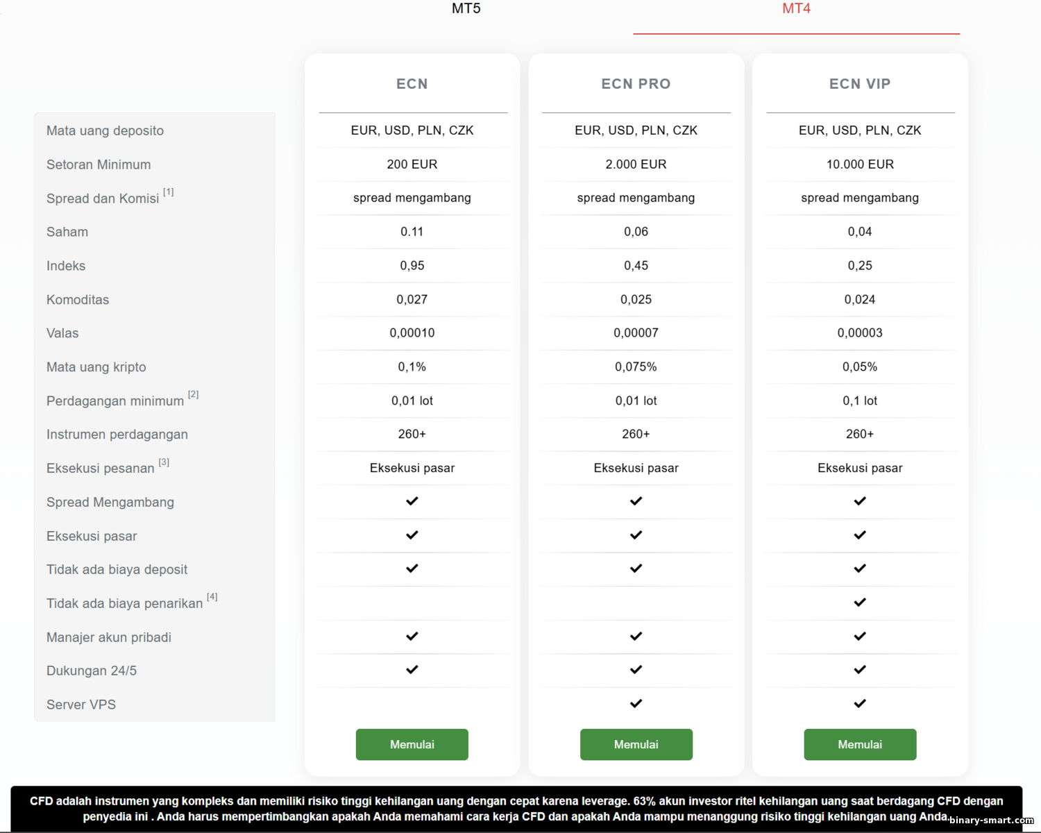 Perhatikan bahwa anak perusahaan Eropa (instaforex.eu) menawarkan akun ECN dengan spread mengambang namun tunduk pada pembatasan ESMA. Leverage dibatasi 1:30, bonus dan kontes tidak tersedia, dan persyaratan modal lebih tinggi. Kebanyakan trader dari CIS dan Asia memilih akun Instaforex.com lepas pantai, yang ketentuannya lebih fleksibel.