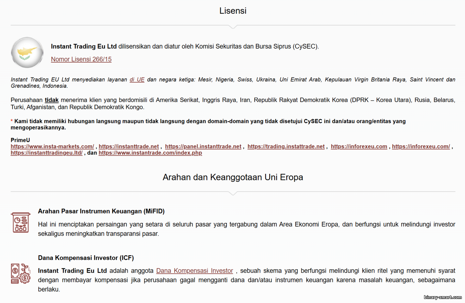 | Registrasi & lisensi | Lepas pantai: BVI (BVI FSC, No. SIBA/L/14/1082); UE: Siprus (CySEC, No. 266/15). Tanpa pengawasan top‑tier (FCA, ASIC, dll.). |