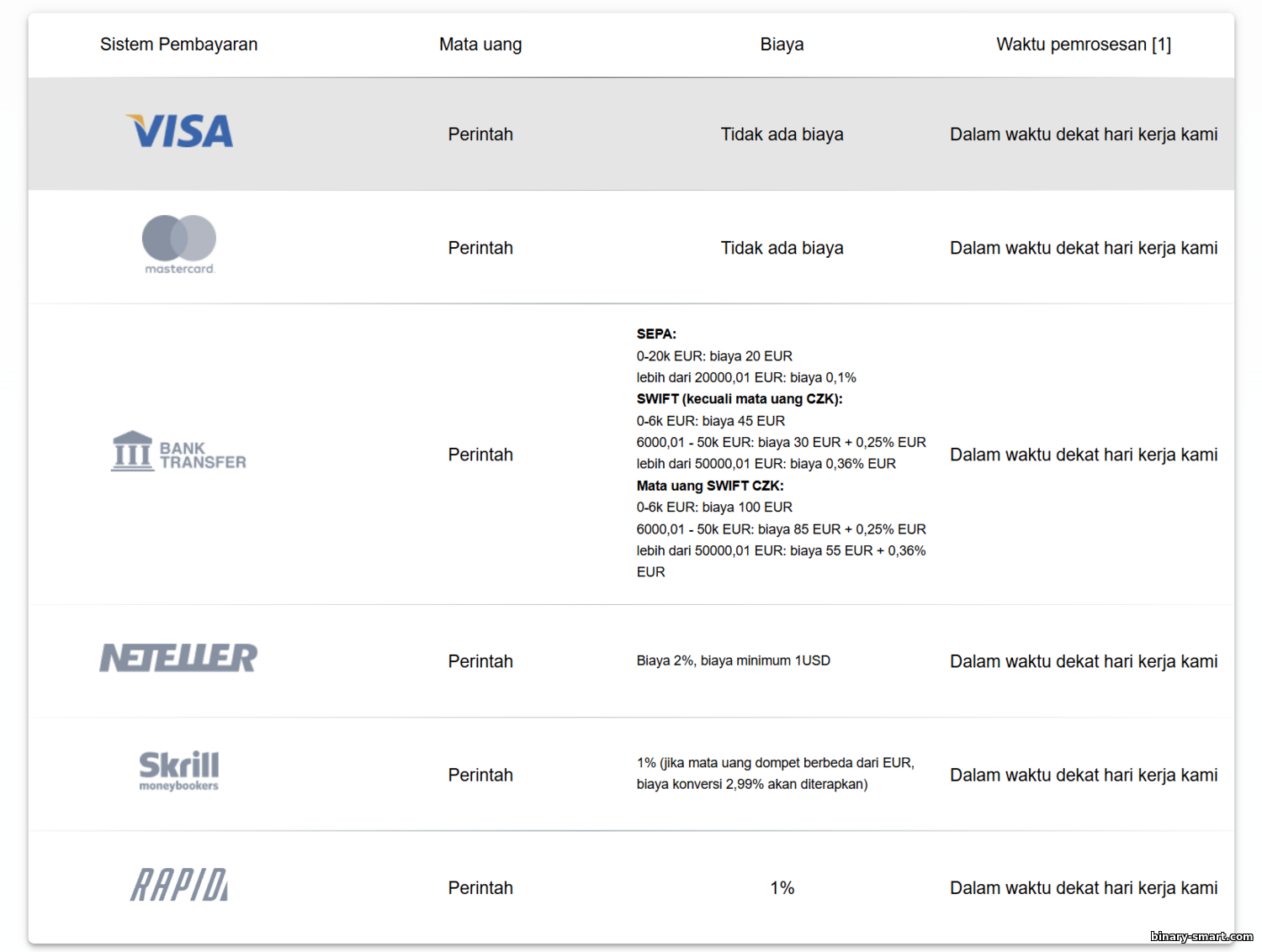 | Pendanaan & penarikan | Transfer bank, Visa/MasterCard, Qiwi, YooMoney, Skrill, Neteller, WebMoney, Perfect Money, kripto (BTC, LTC, dll.). Penarikan—dari hitungan jam hingga 1–3 hari (tergantung metode). Biaya: 0–2% untuk banyak metode, hingga 3,5% untuk sebagian (mis. 3,5% untuk YooMoney). |