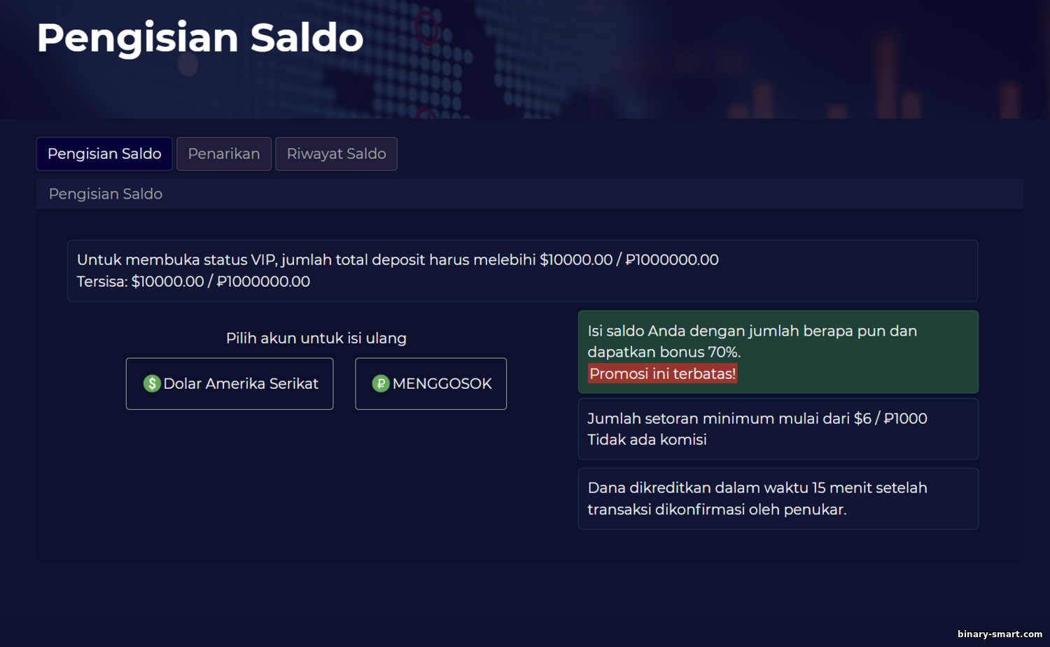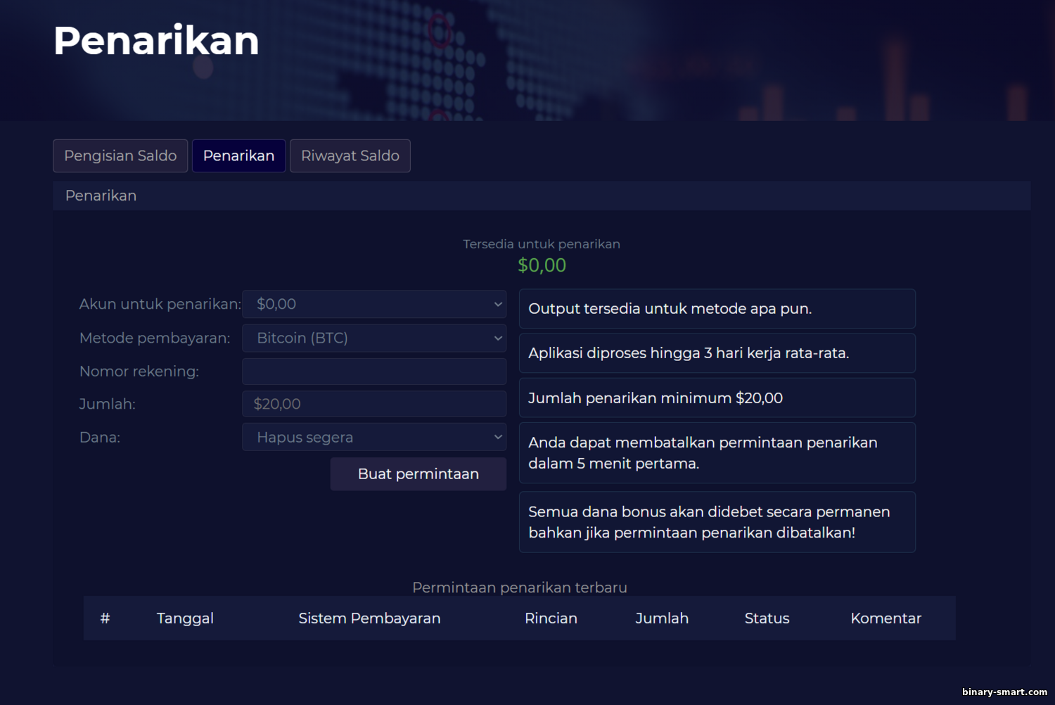 Setelah registrasi, dasbor trader tersedia. Menurut pengguna, antarmukanya cukup sederhana. Bagian kunci meliputi top up saldo, penarikan, riwayat trading dan keuangan, pengaturan profil, dan dukungan (biasanya hanya alamat email dukungan).