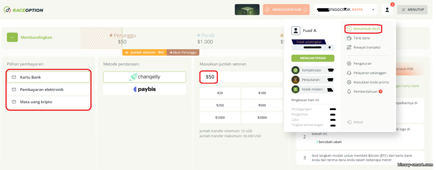 Catatan bahwa penarikan minimum $50. Jika saldo Anda di bawah $50, perlu ditambah dulu agar bisa withdraw. RaceOption tidak menetapkan batas maksimal penarikan, artinya Anda bisa menarik berapa pun.