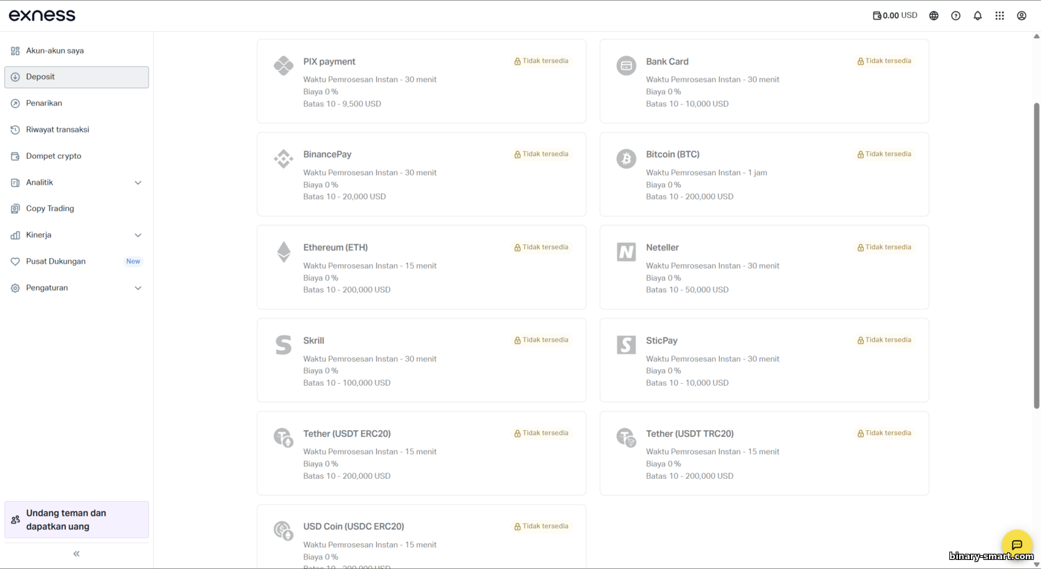 - Konversi mata uang: jika mata uang akun berbeda dari mata uang deposit/aset, biaya konversi FX berlaku (spread pasar). Exness mendukung 45 mata uang akun (USD, EUR, RUB, GBP, dan lainnya) yang membantu meminimalkan konversi.