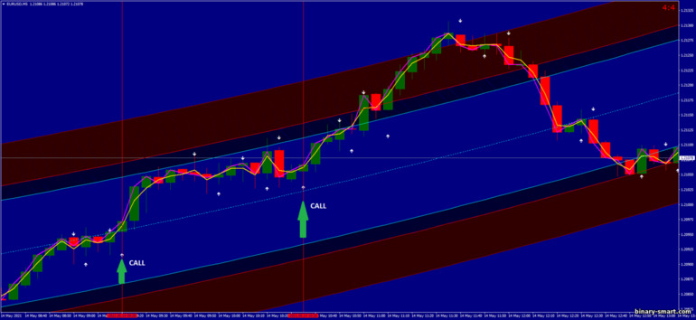 - Ketika panah atas muncul dalam 20 detik atau 2 menit setelah pembukaan candle (masing-masing M1 dan M5), beli opsi CALL pada candle saat ini