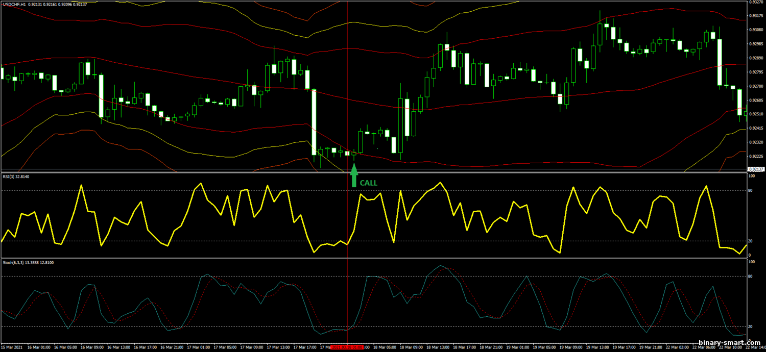 Strategi untuk opsi biner, Forex dan CFD - Bollinger Bands, RSI dan Sistem Perdagangan Stochastic - strategi berdasarkan tiga indikator, digunakan untuk mencari titik masuk dalam arah pergerakan harga tren pada suatu jangka waktu dari 1 jam.