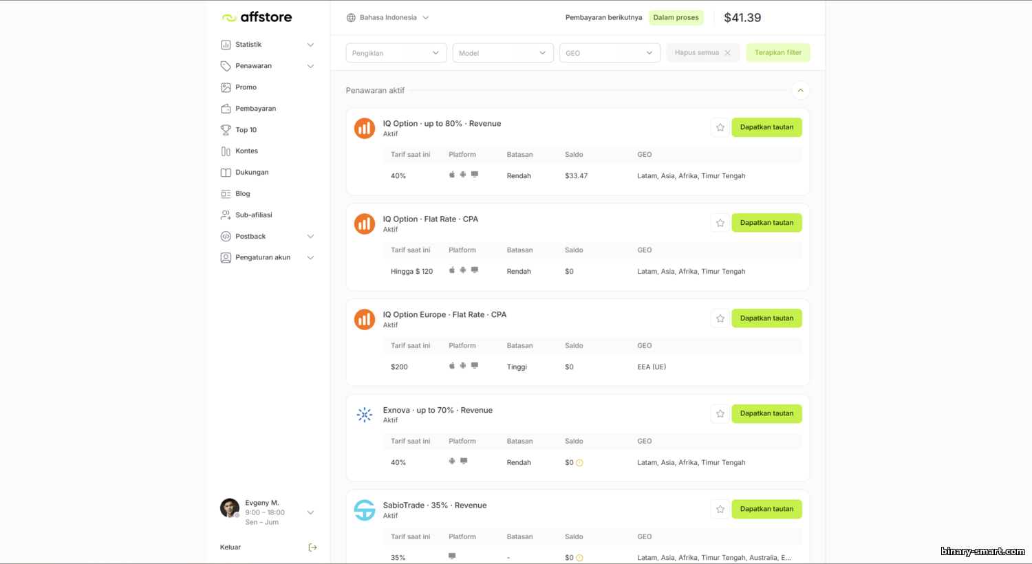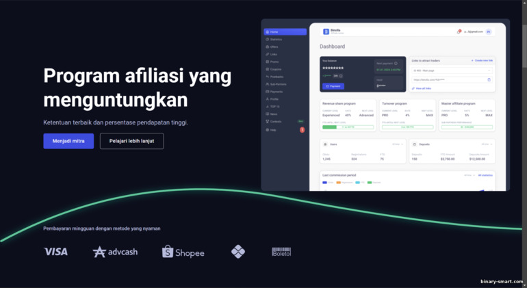 CleverAff adalah program afiliasi untuk broker Binarium. Walaupun broker ini terutama berfokus di wilayah CIS, mereka juga menarik minat trader dari Brasil, Indonesia, dan Malaysia. Jangan berharap variasi materi promosi yang terlalu melimpah—sejumlah ulasan menyebut ketersediaan promosinya relatif terbatas, tetapi broker berusaha memperbaruinya secara berkala. Link program: https://cleveraff.com/