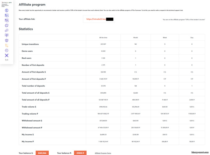 Intrade Bar adalah broker yang cukup disegani di kalangan trader berbahasa Rusia. Program afiliasinya aktif secara otomatis setelah Anda mendaftar, namun perlu diketahui bahwa materi promosi yang disediakan sangat terbatas—Anda kemungkinan harus membuat sendiri. Link resmi — https://intrade.bar/.