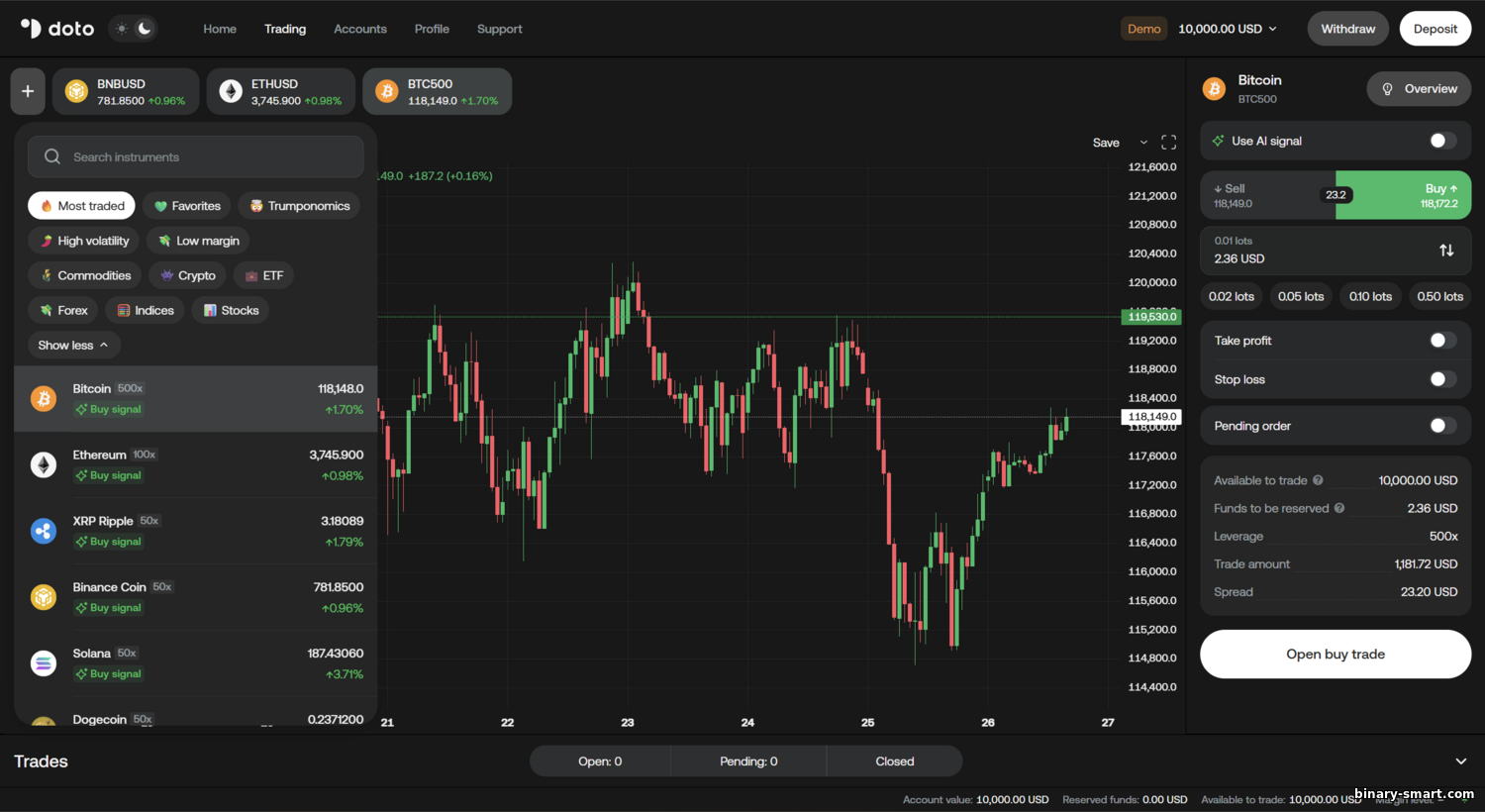- Doto – Broker lebih baharu yang berkembang pantas dan sudah menerima anugerah (contohnya, “Best CFD Broker 2025”). Dikawal selia di beberapa bidang kuasa (CySEC, FSCA, dll.), menawarkan MT4/MT5 serta platform sendiri dengan integrasi TradingView. Kelebihan: ambang kemasukan rendah ($15), rangkaian pasaran luas (forex, saham, komoditi, ETF, CFD kripto). Kekurangan: tiada akaun sen dan kemungkinan yuran untuk tidak aktif berpanjangan.