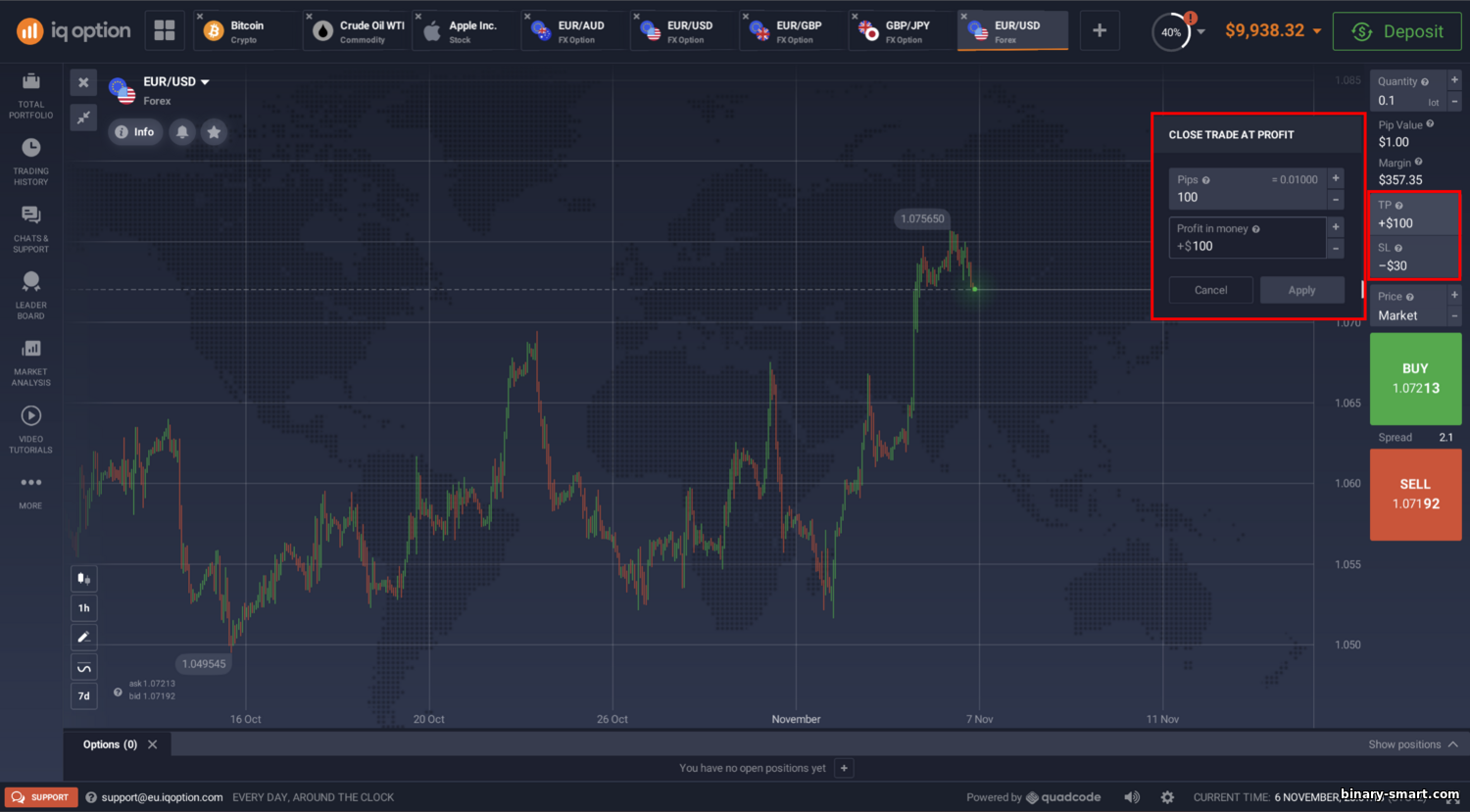 Syarat dagangan: Deposit minimum ialah $10 dan dagangan minimum ialah $1—antara titik kemasukan terendah di pasaran. Spread di IQ Option adalah terapung; pada pasangan utama ia sering ketat (EUR/USD sekitar 0.8–1.0 pip), manakala CFD saham boleh mempunyai spread lebih lebar. Tiada komisen per dagangan (broker memperoleh daripada spread). Kos tambahan boleh termasuk swap untuk memegang posisi semalaman dan yuran pengeluaran bank (sekitar $31, jadi e-dompet atau kad boleh lebih praktikal). Terdapat juga yuran tidak aktif—€10 sebulan jika tiada operasi selama 90 hari. Leveraj untuk klien di CIS dan rantau lain boleh mencecah sehingga 1:1000 pada forex, manakala di EU ia dihadkan kepada 1:30 disebabkan regulasi. Secara keseluruhan, terma adalah fleksibel: mikro-lot tersedia, dengan stop-loss dan take-profit, serta sokongan trailing stop.