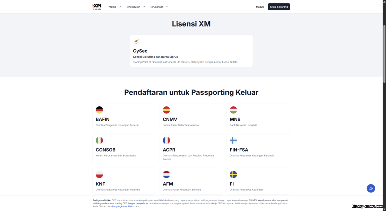 XM Group beroperasi melalui beberapa entitas lintas yurisdiksi, memungkinkannya melayani klien global sambil mematuhi hukum lokal. Saat ini, entitas kunci XM memegang lisensi dari regulator berikut: