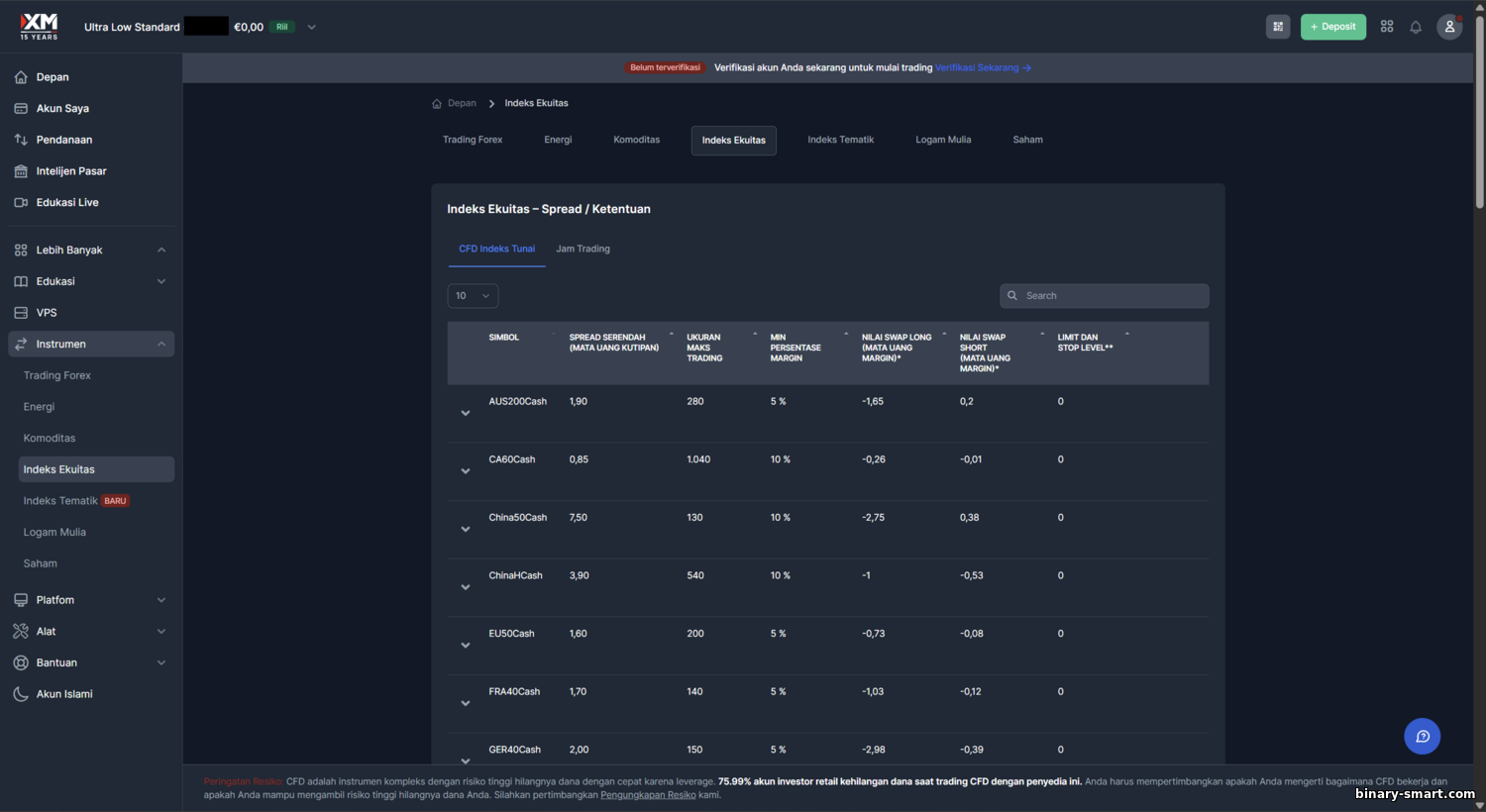 - CFD saham: ~0,1% dari nilai transaksi (minimum $1 untuk AS, $5 untuk Eropa, ~$9 untuk Inggris). Spread biasanya mengikuti pasar (nyaris 0). Contoh, membeli 100 CFD Apple senilai $15.000 biayanya ~ $15 — kompetitif.