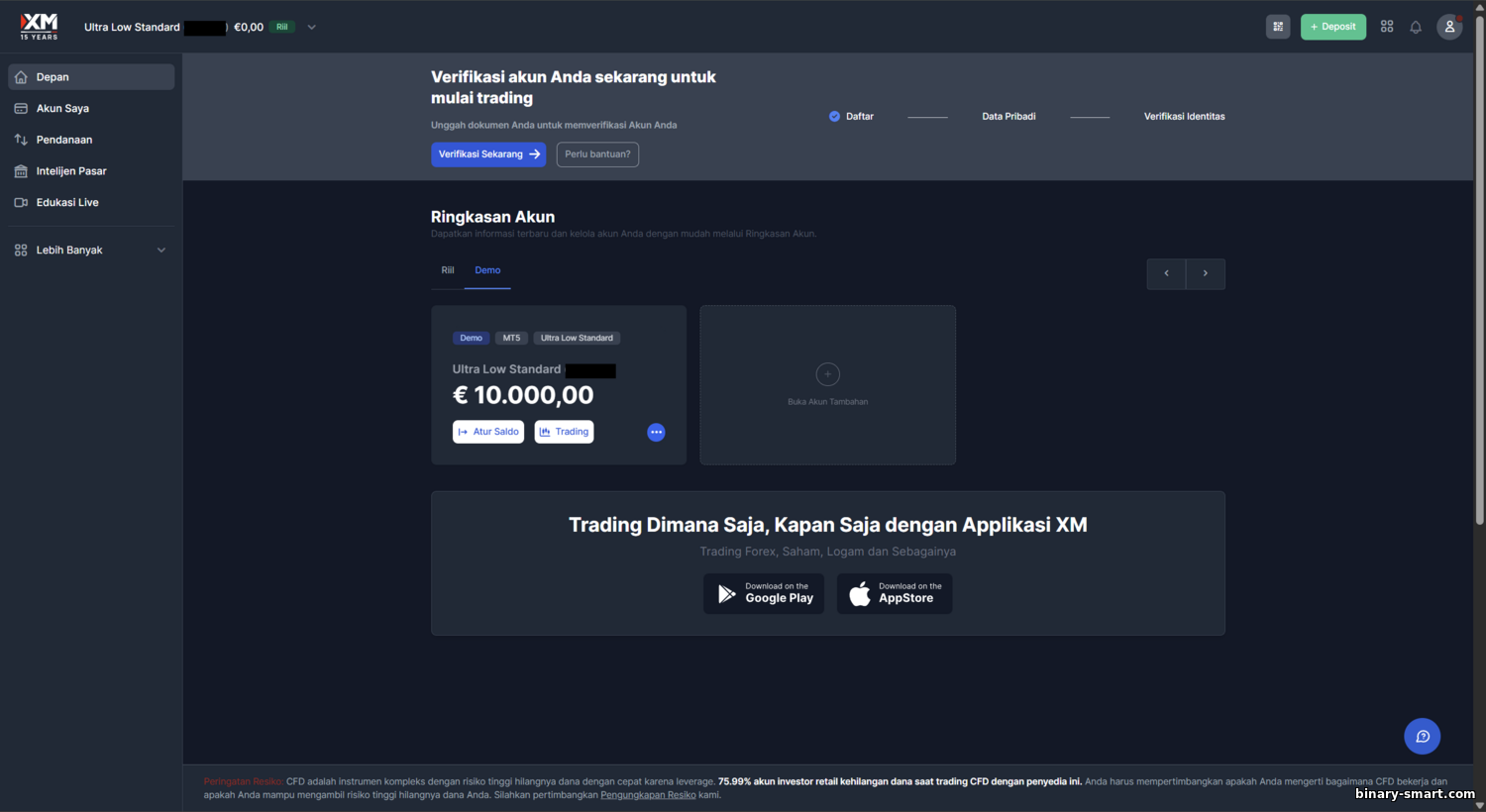 Deposit minimum dan mata uang dasar. Pada sebagian besar akun XM, ambang masuk benar‑benar mulai $5 (atau ekuivalennya). Anda dapat memilih mata uang dasar saat registrasi: USD, EUR, GBP, JPY, CHF, AUD dan beberapa lokal (HUF, PLN, RUB, ZAR, SGD, dll.). Untuk klien CIS, akun USD, EUR atau bahkan RUB bisa praktis (XM mendukung akun RUB). Anda dapat memiliki hingga 8 akun aktif per klien, jadi mudah membuka beberapa tipe dan mata uang sekaligus. Misalnya, simpan akun Micro USD untuk eksperimen dan akun Ultra Low EUR untuk trading utama. Akun demo tak terbatas.