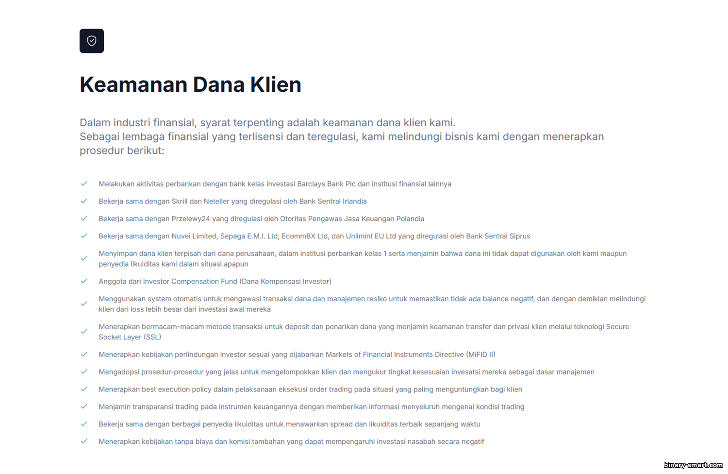 | Perlindungan dana | Rekening terpisah, perlindungan saldo negatif, dana kompensasi investor (UE) |