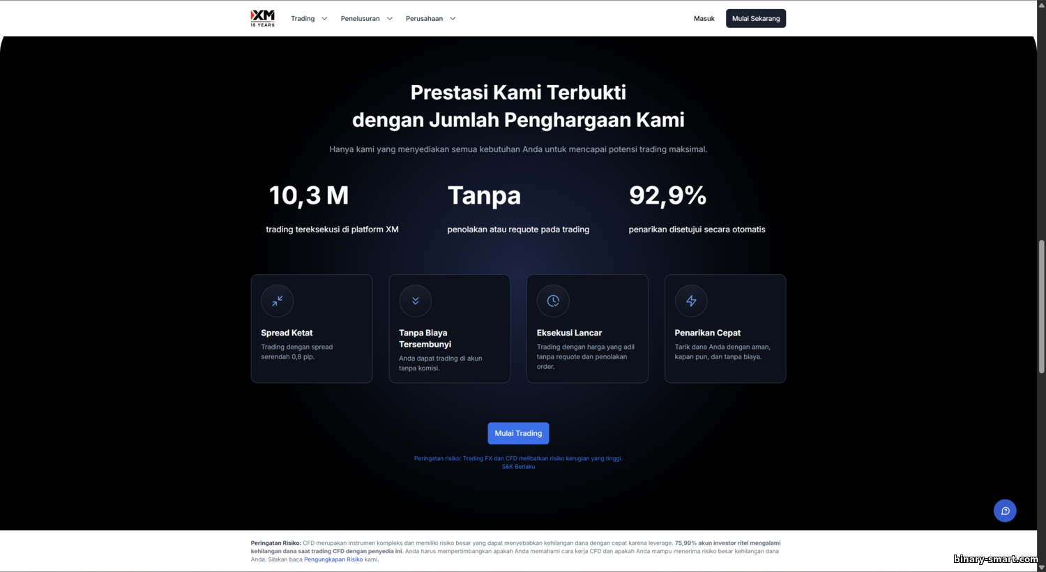 Merek XM (situs resmi — xm.com) menawarkan spektrum layanan luas: 1.000–1.400+ instrumen (pasangan mata uang, CFD saham, komoditas, indeks, kripto, dan lainnya), ambang masuk rendah mulai $5, leverage hingga 1:1000, dan pusat edukasi yang kaya. XM dikenal dengan eksekusi cepat dan andal — 99,35% order terisi di bawah 1 detik tanpa requote. Perusahaan memegang kebijakan “BIG, FAIR, HUMAN” — setiap klien, terlepas dari besaran deposit, mendapat layanan perhatian penuh dan Negative Balance Protection. Dana disimpan di rekening terpisah (terpisah dari dana perusahaan) di bank tier‑satu, dan klien Eropa memiliki perlindungan tambahan dari dana kompensasi investor hingga €20.000.