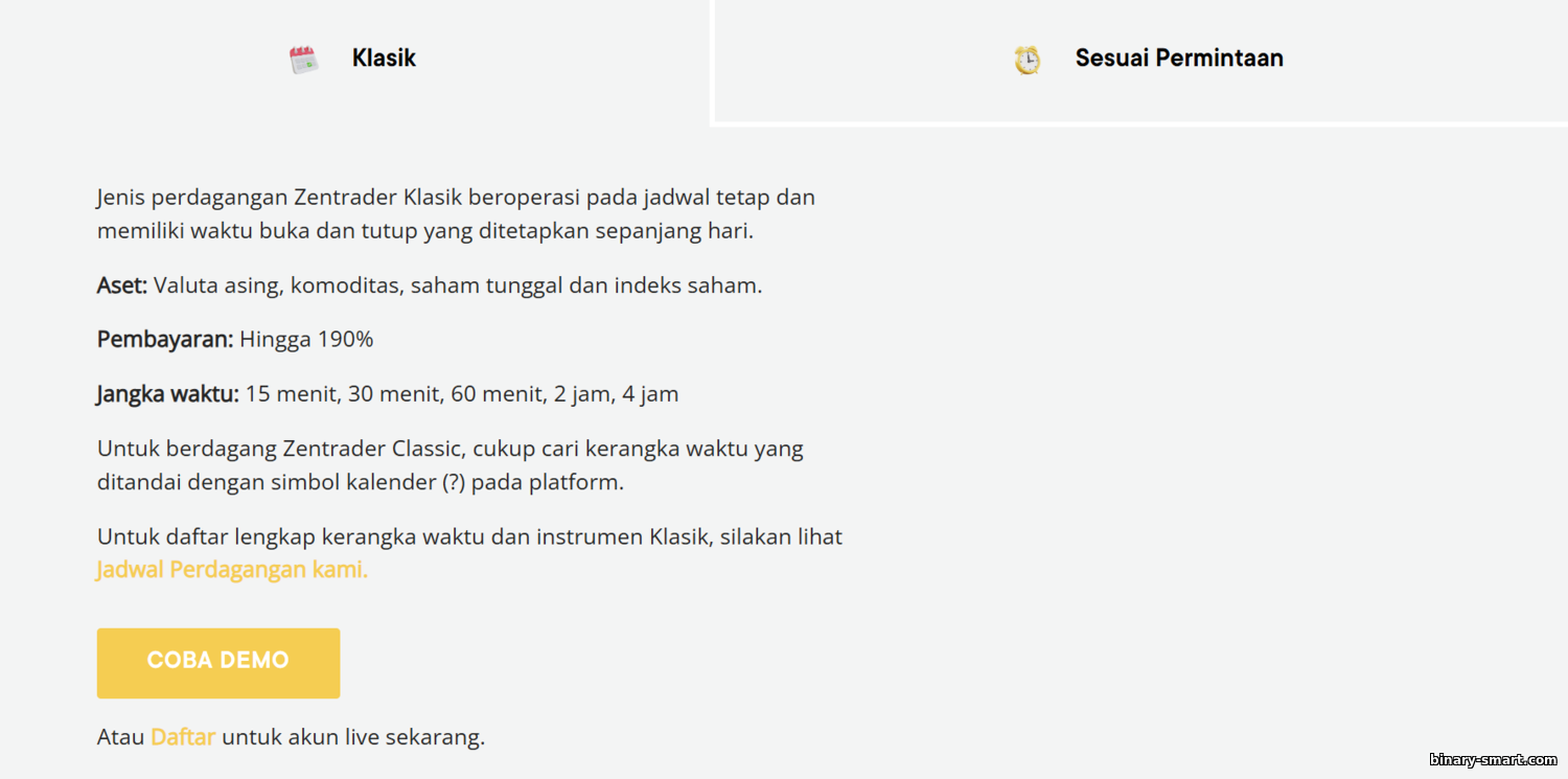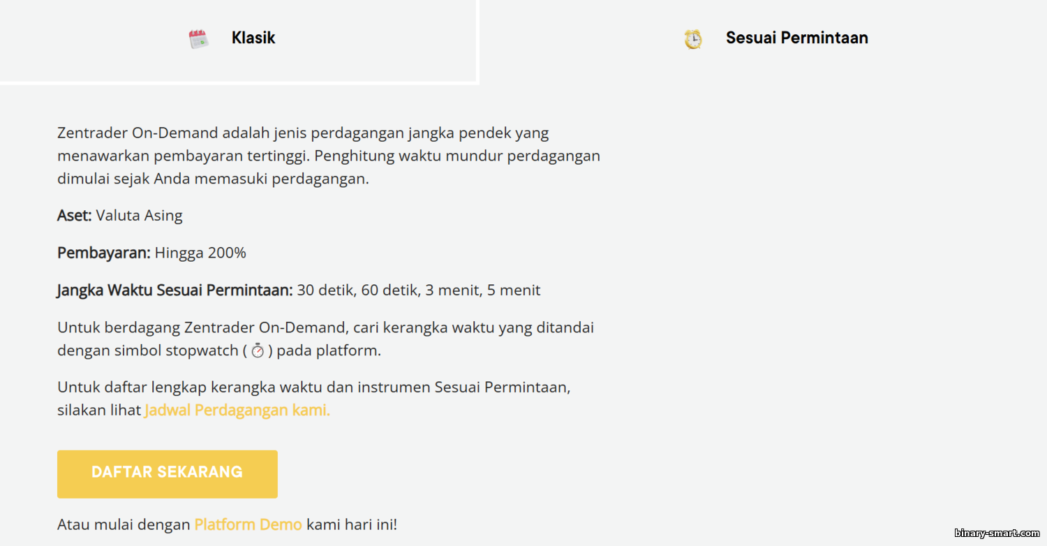 Salah satu fitur unik Zentrader adalah dua jenis opsi biner dengan pengaturan kedaluwarsa berbeda: